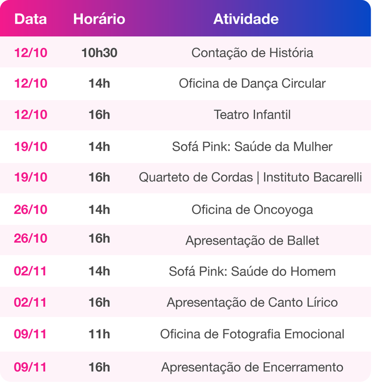 O projeto também contempla vivências, workshops e aulas diversas, tais como oficina de escrita criativa, oficina de Fotografia, Aula de onco ioga e curso de automaquiagem.